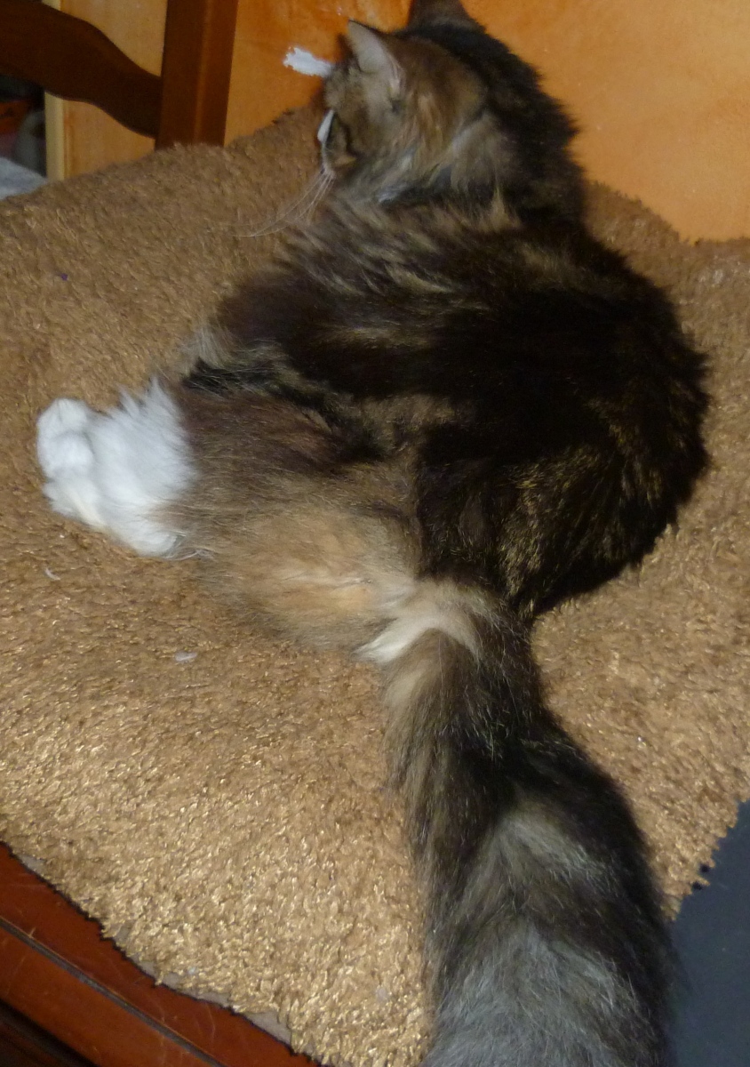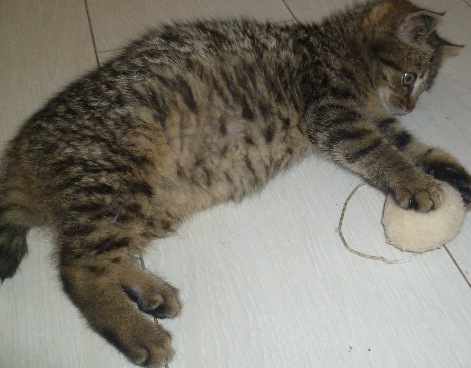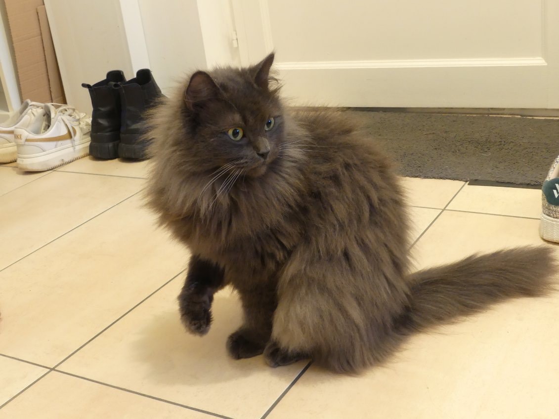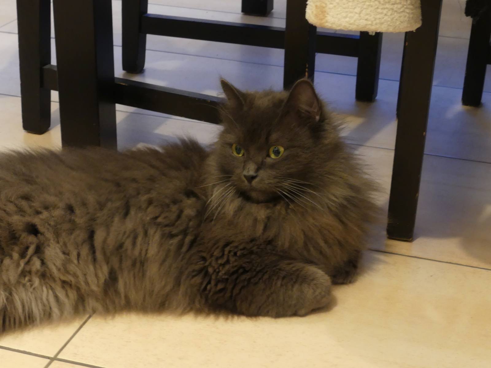 Il nous a fallu le faire amputer d’une partie de sa queue, écrasée par on ne sait quoi (peut-être coincé dans un moteur..), il a un pelage très dense et soyeux.