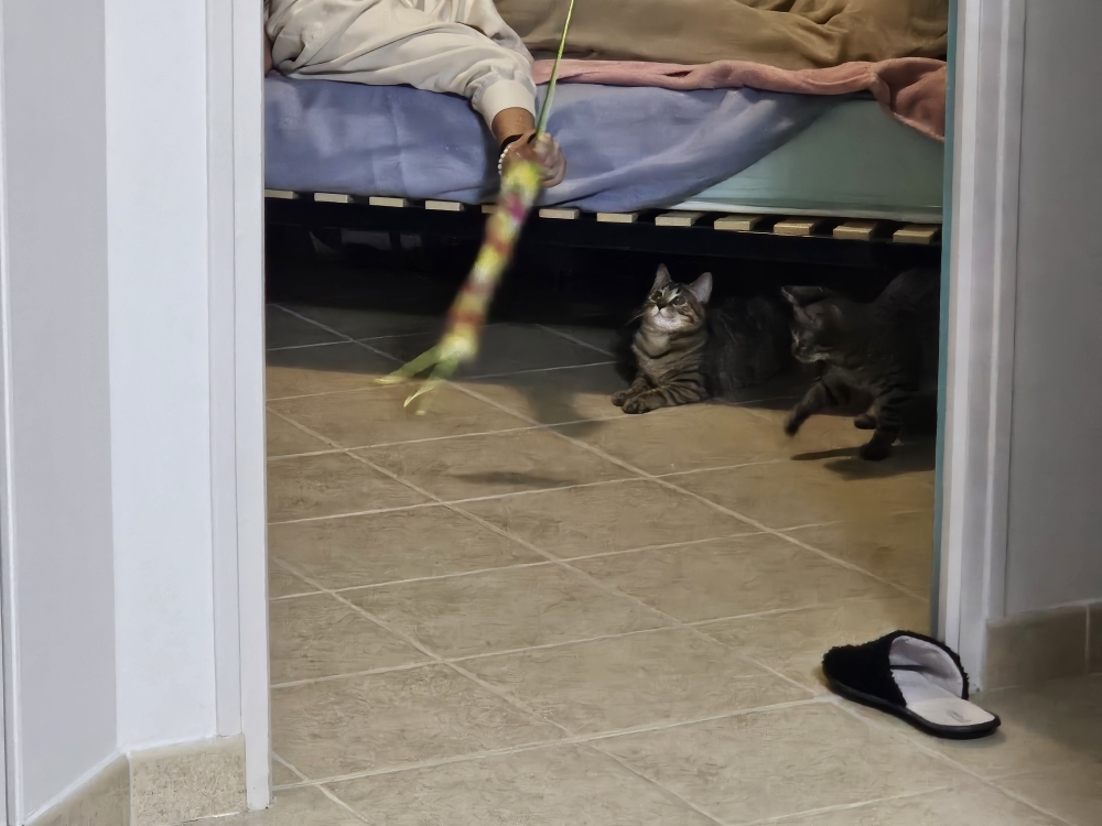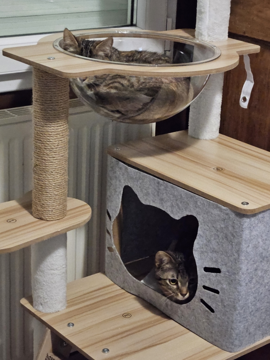 Les premiers moments ont été un peu compliqués : contre toute attente, notre premier chat se montre assez jaloux, même s’il reste très intrigué. Il y a tout de même eu du mieux aujourd’hui. Rome ne s’est pas faite en un jour, après tout !