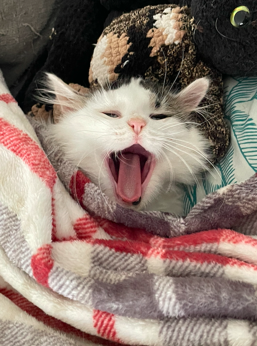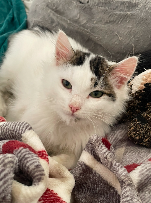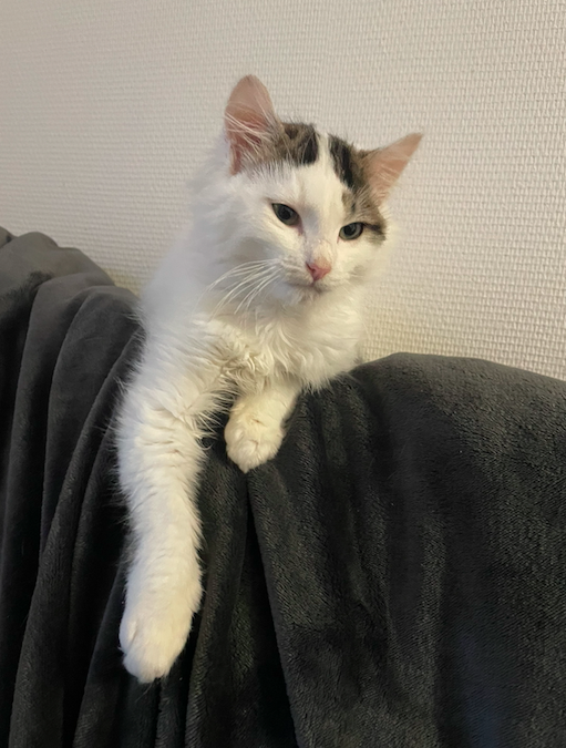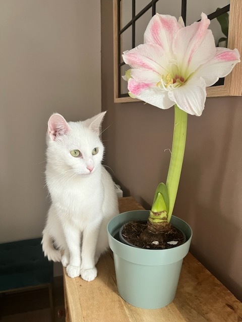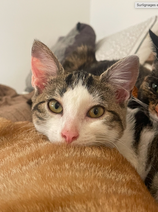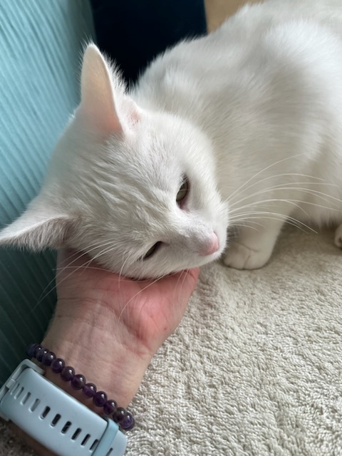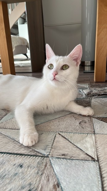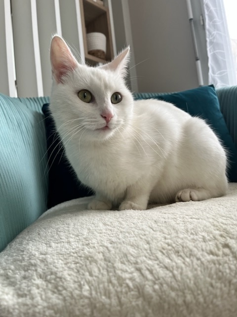 Il s’agit donc de SNOWY ( surnommée ainsi de part sa couleur blanche ), née en été 2024 et qui a mis bas de 4 petits chatons chez moi en Août dernier.