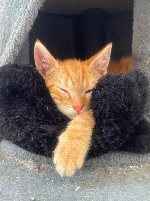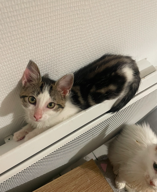 Errant depuis plusieurs semaines seul dans la forêt, ce petit chaton nous a été confié par une dame qui le nourrissait.