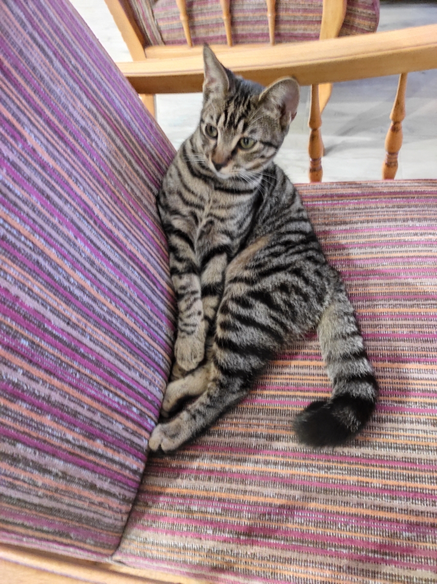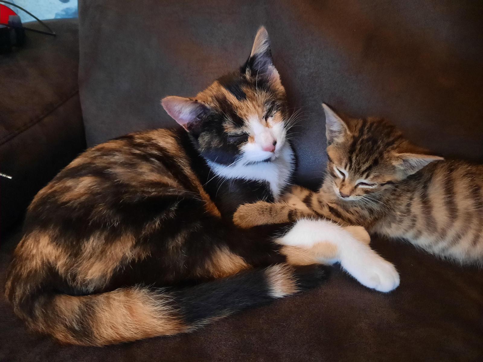 Chipie joue plus que sa sœur. Elles mangent bien toutes les 2 . Heureusement que nous les avons pris toutes les 2 car elles sont très complices et ont besoin l’une de l’autre. Elles s’appellent quand elles ne se voient plus. Elles dorment ensemble l’une contre l’autre, voire la tête de l’une sur l’autre. Mistral fait la toilette de sa sœur