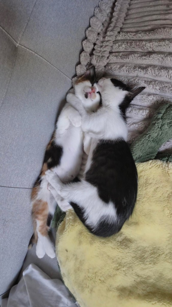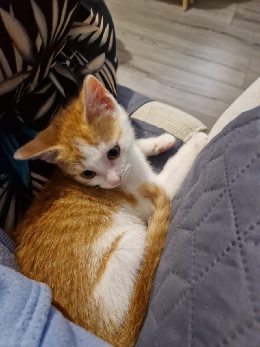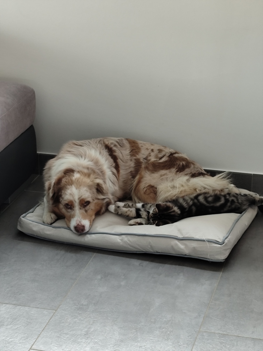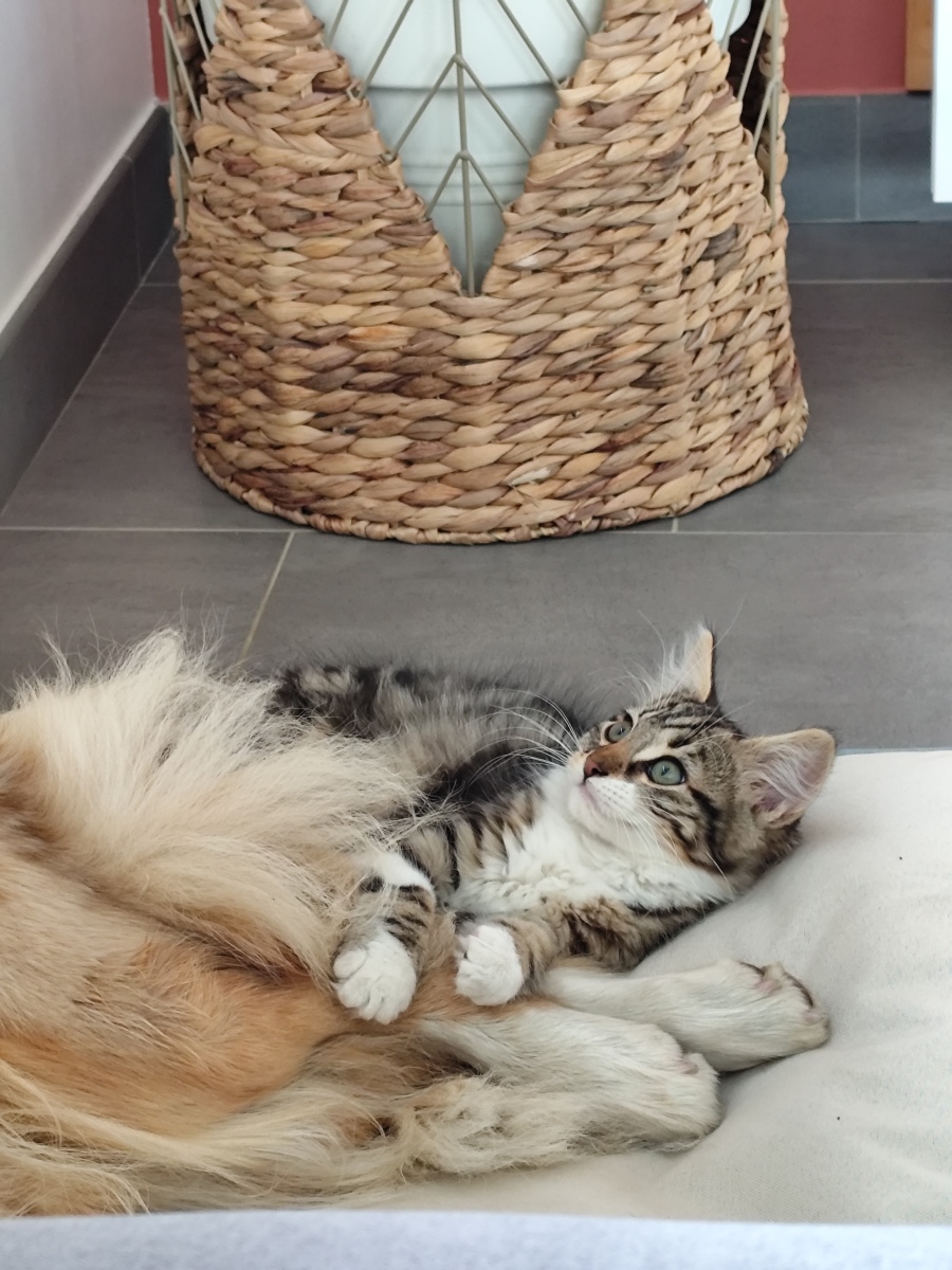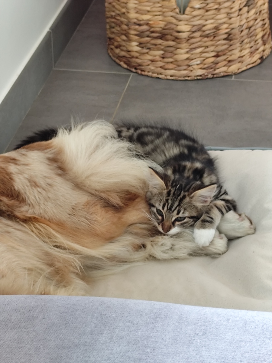 J’ai un joli panier tout doux rien qu’à moi… mais entre nous, dormir dans les bras de « maman », c’est quand même bien mieux !