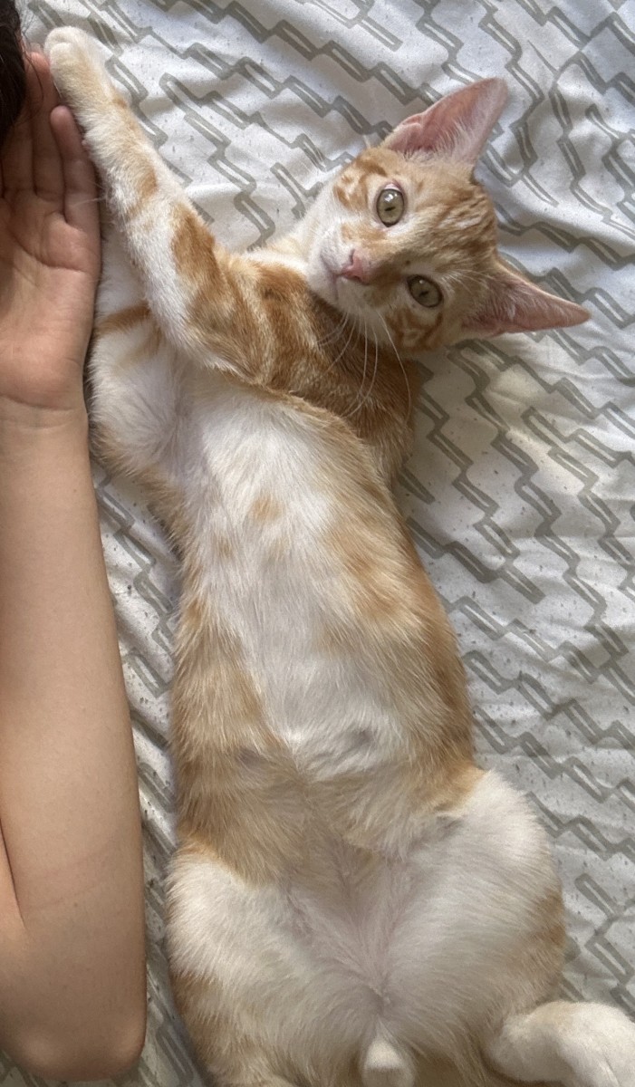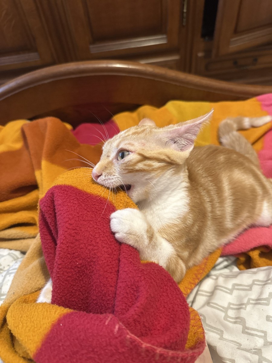 Mais il n’est pas seulement joueur, il est aussi très câlin. Il adore venir chercher des caresses, se frotter contre nous, et il a même pris l’habitude de dormir avec nous, blotti bien au chaud. C’est un vrai bonheur de l’avoir à nos côtés, il a déjà trouvé sa place dans la famille et on ne pourrait pas rêver mieux.