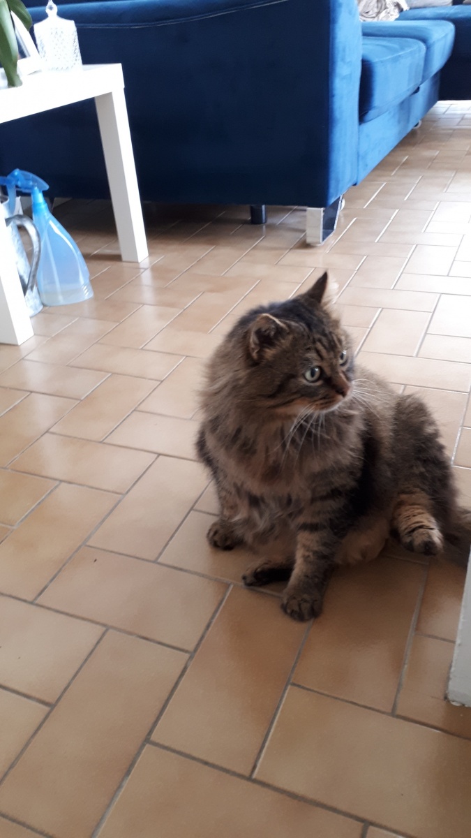 Photo de notre Léon, habitué à vivre dehors, et qui, maintenant coule des jours heureux chez Aurélie et Pierre et leurs deux enfants, pour lesquels il a beaucoup d’affection….